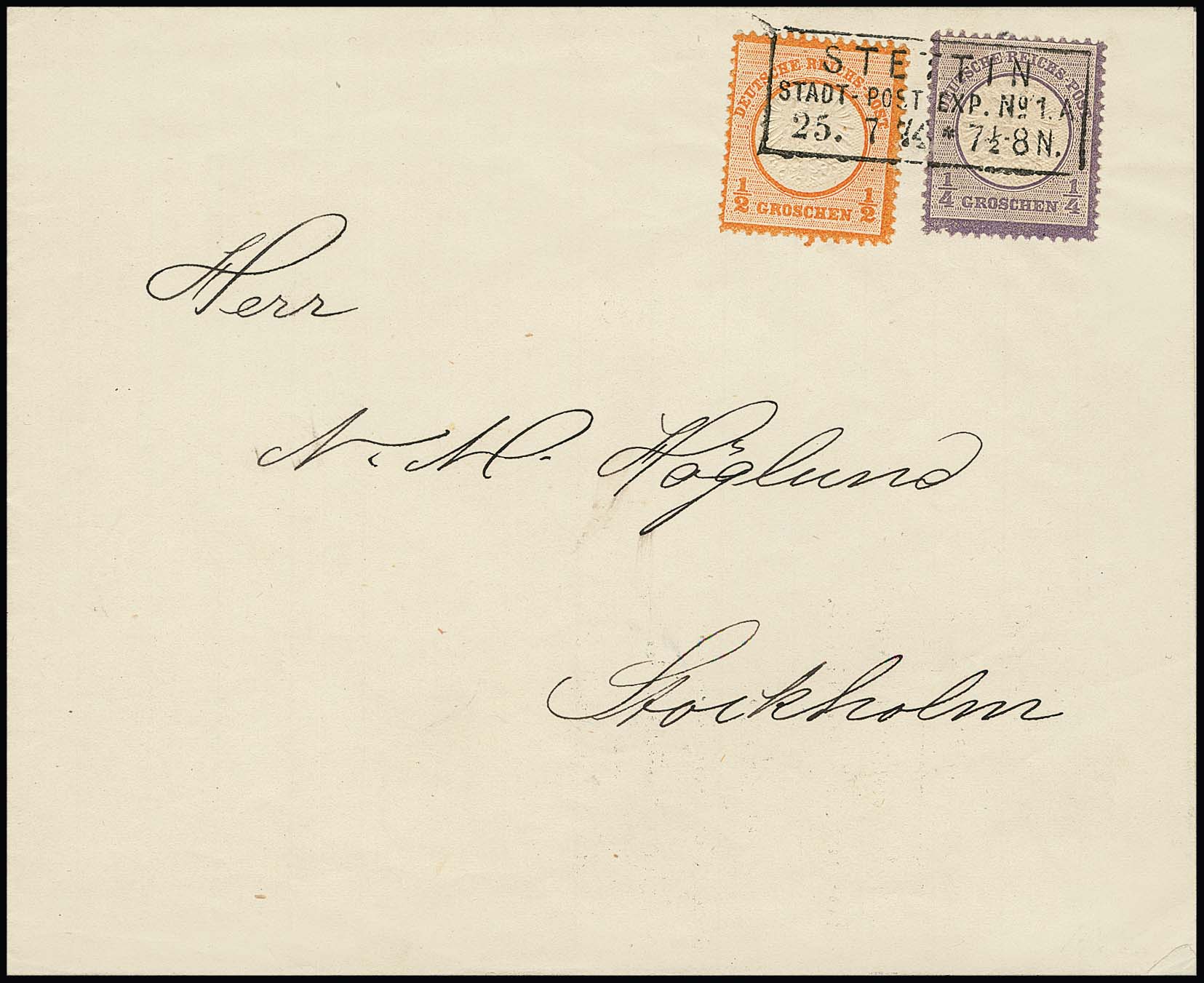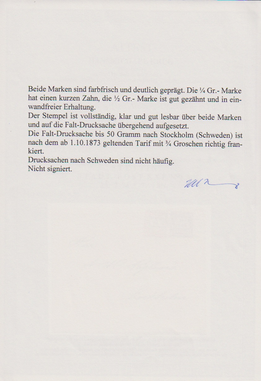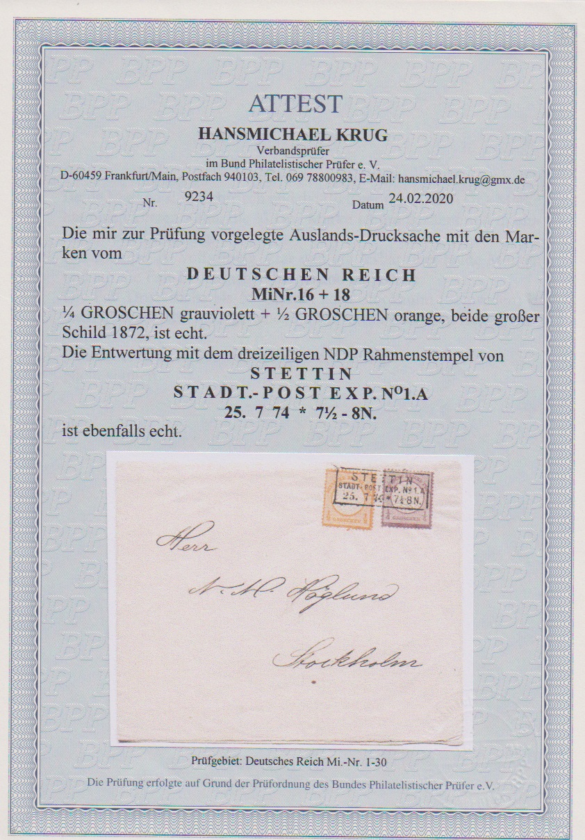 1/4 Gr. violett (ein verkürzter Zahn) nebst 1/2 Gr. orange auf prachtvoller Auslands-Drucksache mit Ra3 "Stettin Stadt-Post Exp. No. 1A" 1874 nach Stockholm/Schweden. Attest Krug