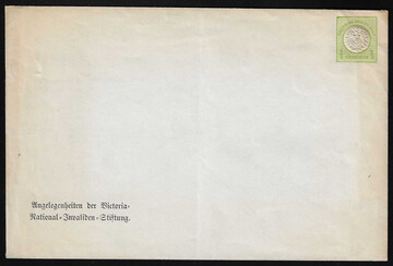 Privat-Ganzsachen, drei ungebrauchte Victoria-National-Invaliden-Couverts 1/3 Gr. grün (Format "b" doppelt), sowie Anzeigen-Faltbrief 1 Gr. rosa (kl. Mgl.), je ungebraucht