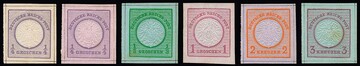 Brustschild-Ganzsachen auf Privatbestellung, sechs versch. Wertstempel-Abzüge großes Schild, 1/4 Gr. auf sämisch und rosa, 1/3 Gr. auf grün, 1 Gr. rosa, 2 Kr. auf rosa und 3 Kr. auf grün, alle mit Rahmen (Proben, Fouré?) ungeklärter Herkunft