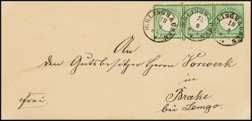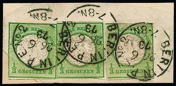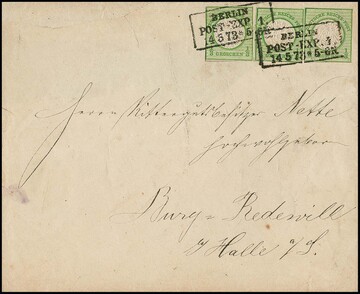 Ganzsachen-Ausschnitte 1/3 Gr. grün per drei als sehr ungewöhnliche Mehrfach-Frankatur auf Couvert (min. Öffnungsmängel) mit Ra3 "Berlin Post-Exp. 1", 14.5.73. Ex Kruschel, Attest Krug "in einwandfreier Erhaltung ... Sehr seltene Mehrfachfrankatur mit Ganzsachen-Ausschnitten".
