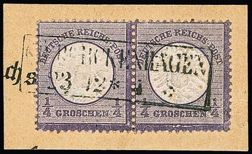 1/4 Gr. violett im Paar auf Briefstück mit Preußen-Ra2 "Gr. Brockenhagen", rechte Marke ein ergänzter Eckzahn, aber mit Plattenfehler "zwei helle Punkte unten" (Feld 139), Fotoexp. Krug