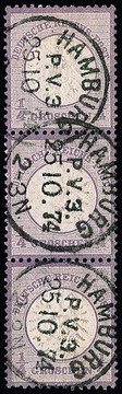 1/4 Gr. violett, senkrechter prachtvoller Dreierstreifen (nur obere Marke oben ein kurzer Zahn) mit klaren K1 "Hamburg P.V.3", Fotoexp. Krug. Mi. 500,-