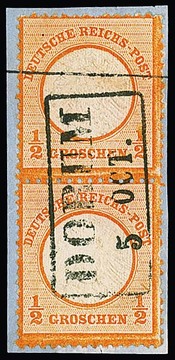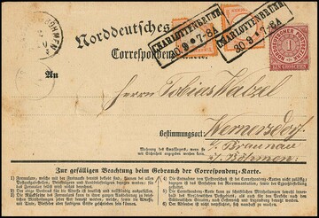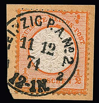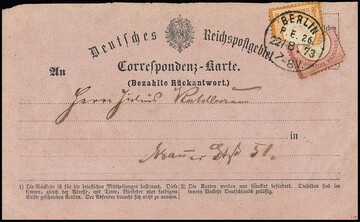 1/2 Gr. orange und 1 Gr. rosa, zwei "Halbierungen" (siehe Foto) als Postbetrugs-Frankatur auf Orts-Postkarte mit K1 "Berlin P.E. 26" 1873, ohne Nachtaxe. Die fehlerhaften Marken in dieser Form unbeanstandet und ohne Nachtaxe befördert, so wohl Unikum. Sign. Krause, Hennies und Attest Krug