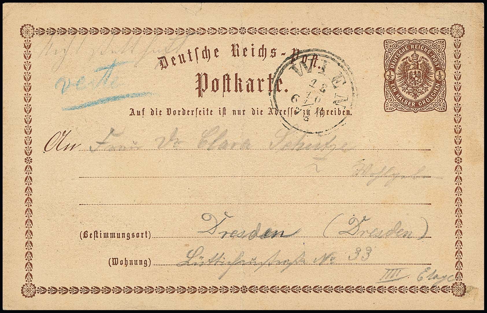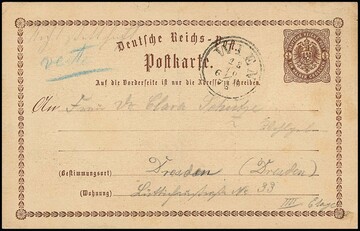 Ganzsachenkarte 1/2 Gr. braun in seltener unbeanstandeter Fremdverwendung mit Ortsstempel "Wien" (K2) 1873 nach Dresden. Sehr ungewöhnlich (sonst fremde Stempel fast nur auf Antwort-Ganzsachenkarten vorkommend). Karte leichte Mittelbug