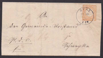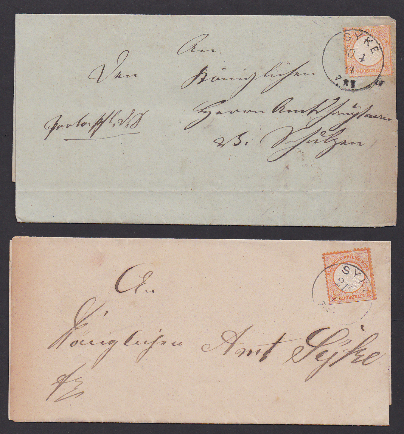 1/2 Gr. orange je einzeln auf drei Ortsbriefen mit neuem K1 "Syke", u.a. nach Schnepke, trotz kl. Mgl. interessante Belegstücke dieses für seine Halbierungen bekannten Ortes, alle Briefe an untersch. Empfangsorte (zweimal im Landbezirk)