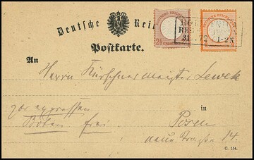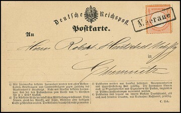 1/2 Gr. orange, Plattenfehler "Farbstrich am Aussenkreis", auf frischer Kabinett-Postkarte mit besserem Sachsen-Bahnpost-Ra1 "Meerane", dazu 1/2 Gr. auf spät 1873 verwendeter NDP-Correspondenzkarte, Attest bzw. Fotoexp. Sommer