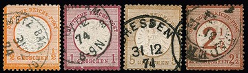 1/2 Gr. orange, 1 Gr. rosa (aus Frankfurt/Main, Kreuzerbezirk!), 5 Gr. ockerbraun und 2 1/2 a. 2 1/2 Gr. rotbraun, variierende Erhaltung von gut bis kleine Mängel, alle mit Stempeln vom Währungsletzttag, 31.12.74. Eine Fotoexp. Sommer