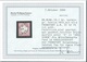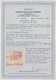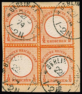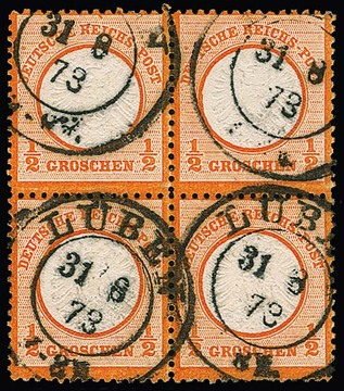 1/2 Gr. orange im Viererblock mit klaren K2 "Lüben", die rechte untere Marke zwei kurze Zähne, sonst gut. Linke obere Marke (von Bogenfeld 107) mit Plattenfehler VIII, "Farbstrich über EI in REICHS", Fotoexp. Krug