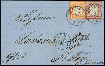 1/2 Gr. orange und üblich gezähnte 2 1/2 Gr. rotbraun auf prachtvollem Brief mit K1 "Bremen" 1873 nach Frankreich