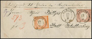 1/2 Gr. orange, zwei Marken-Fragmente, einmal aus mehreren Marken zusammengesetzt, als offensichtliche Postbetrugs-Frankatur auf NDP-Correspondenzkarte (typ. Aktenspieß ausserhalb), diese bereits mit jetzt ungültiger NDP 1 Gr. rosa vorfrankiert, mit Ra2 "Charlottenbrunn" nach Braunau in Böhmen, Unikum