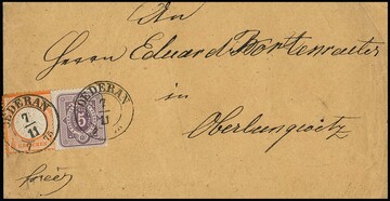 1/2 Gr. orange (links kleine Mängel durch Randklebung) in seltener wertgleicher Währungs-Mischfrankatur mit 5 Pfge. purpur auf beigem Couvert mit spätem Sachsen-K2 "Oederan" vom 7.11.1875