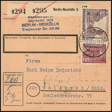 15 Pfg. Bauten, bessere Einzelfrankatur auf Posteinlieferungsschein für ein Paket aus Berlin 1952