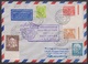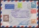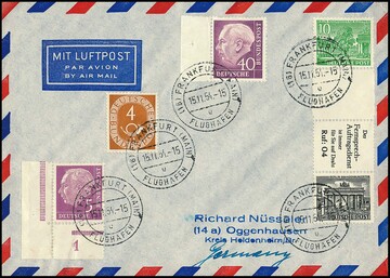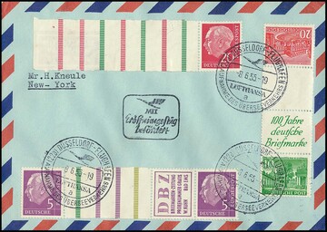 20 und 10 Pfg. Bauten, senkrechter Reklame-Zwischensteg-Zusammendruck "100 Jahre Deutsche Briefmarke", nebst Bund-Heuss-Zusammendrucken RL1 und WZ5, auf Luftpost-Erstflug-Brief 1955 nach New York mit rs. Ankunftsstempel, Mi. 1335,- +