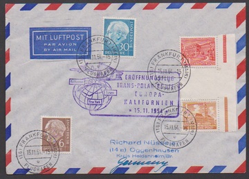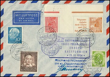 20 Pfg. Bauten, waagerechter Reklame-Zusammendruck "Die Briefmarke", nebst ZuF, auf portoger. Erstflug-Lupo-Brief 1954, Mi. 600,-