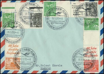 10 und 20 Pfg. Bauten, senkrechter Kehrdruck-Zwischensteg-Zusammendruck "100 Jahre deutsche Briefmarke", nebst Zusammendrucken S2, SZ1B und SZ6, auf Lupo-Brief nach Madrid mit rs. Ankunftsstempel. Mi. 1234,- bzw. lose gest. 734,-