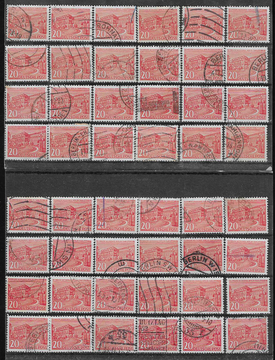 20 Pfg. Bauten, Spezialistenbestand von ca. 25.000 Werten, alle mit Plattenfehlern und Feldmerkmalen, sorgfältig vorbestimmt auf Steckkarten. Der Michelwert für die normalen Marken, ohne Plattenfehler, beträgt ca. 12.5000,-, mit PF gewaltige 150.000,-. Dabei z.B. P1-S5a, P1-S6 (TM48) und P1-S13 (TM140), oft mehrfach, nach ArGe-Spezialliteratur