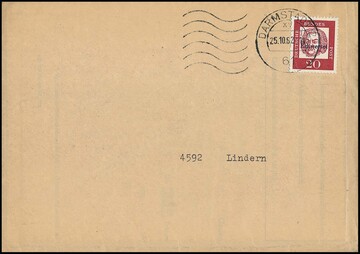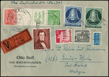 20 u. 10 Pfg. Bauten, Kehrdruck-Reklame-Leerfeld-Zusammendruck, nebst u.a. 20 Pfg. Lortzing sowie 10 u. 30 Pfg. Glocke links, auf Wertbrief, ferner SZ4B auf R-Brief, Mi. 1300,-