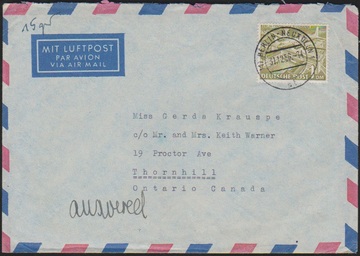 1 DM Bauten als EF auf Lupo-Überseebrief von Berlin-Neukölln 1956 nach Kanada