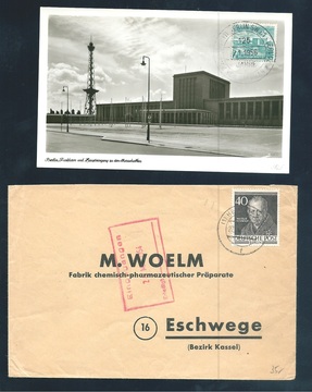 40 Pfg. Humboldt als EF auf Bedarfs-Doppelbrief von Berlin, sowie 7 Pfg. Funkturm auf früher Maximumkarte