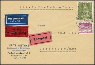 5 Pfg. und 1 DM Stadtbilder auf Lupo-Expreß-Rohrpostbrief von Reinickendorf nach Offenburg, sowie 20 u. 25 Pfg. Bauten (Nr. 146/47) auf Lupo-Rohrpostbrief nach Mannheim