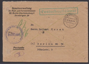 1951, 6.9., Postsache, Brief der Senatsverwaltung für Post- und Fernmeldewesen als Postschnelldienst-Brief von Charlottenburg nach Berlin SO36, Couvert zugezogene Lochung