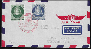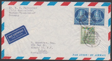 Drei bessere Belege: 4 Pfg. Gedächtniskirche per fünf als MeF, ferner 10 Pfg. Gedächtniskirche und Paar 30 Pfg. Glocke Mitte auf Lupo-Überseebrief ab Berlin-Wilmersdorf, sowie 8 Pfg. Männer II per fünf als hohe MeF
