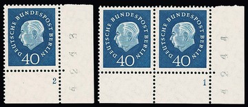40 Pfg. Heuss-Medaillon, zwei postfrische Bogenecken rechts unten mit Form-Nr. "1" (Paar) bzw. "2" und zusätzlich rechts Bogenzähl-Nr., sowie 70 Pfg. zwei postfrische Ecken mit FN "1" (ein Paar)