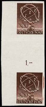20 Pfg. UPU, der geschnittene Probedruck in schwärzlichgelbbraun im postfrischen senkrechten Zwischenstegpaar mit breitem linkem Bogenrand (übliche Vorfaltung im Steg). Seltene Einheit aus den unzertrennten Druckbogen, Mi. nicht bewertet (die zwei losen Marken schon 2000,-), Attest Schlegel für zerteilten Viererblock