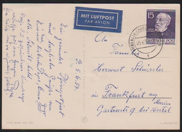 15 Pfg. Virchow als bessere EF auf Lupokarte von Berlin-Charlottenburg 1954 nach Frankfurt