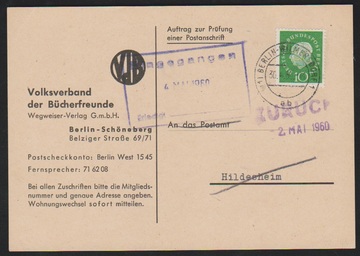 10 Pfg. Heuss jeweils als gute Einzelfrankatur auf zwei Anschriften-Prüfkarten ab Berlin und retour