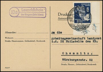 6 Pfg. Frieden aus der rechten unteren Bogenecke mit sehr seltenem Druckvermerk auf Karte 1951 von Königsheim nach Chemnitz, Mi. postfr. bereits 500,-, gest. bzw. auf Brief je ohne Preis