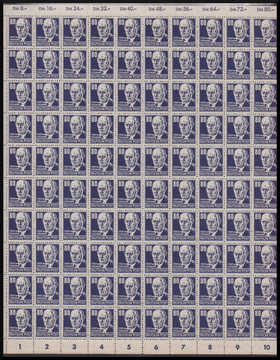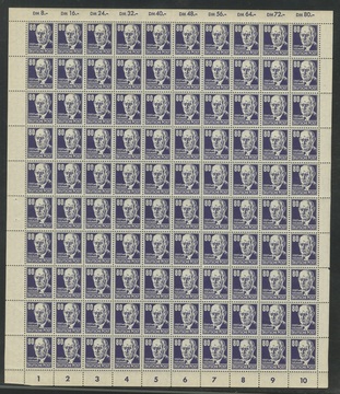 80 Pfg. Köpfe im kompletten postfrischen Bogen mit zweimal Plattenfehler II und einmal IV. Mi. lose 1792,- + Ränder etc.