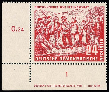 24 Pfg. Deutsch-Chines. Freundschaft als postfrische linke untere Bogenecke mit Druckvermerk. Mi. 450,-