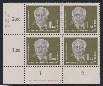 1 Mk. Pieck im postfrischen gef. Viererblock aus der linken unteren Bogenecke mit Druckerzeichen, Mi. 270,-