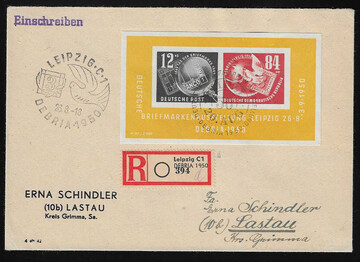 Debria-Block auf gelaufenem R-FDC mit Ankunftsstempel, Mi. 200,-