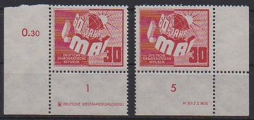 30 Pfg. 1. Mai, je postfrische Bogenecken mit Druckvermerk und Druckerzeichen, Mi. 180,-