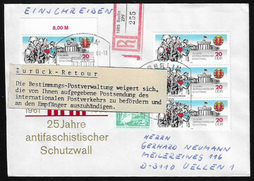 20 Pfg. Berliner Mauer je per vier, nebst ZuF, auf vier Einschreibebriefen 1986 (mit motivgleichem Vordruck) nach Westdeutschland. Dreimal als Postkriegsbeleg retour (Aufkleber "Die Bestimmungs-Postverwaltung weigert sich, ... auszuhändigen."), einmal anstandslos befördert