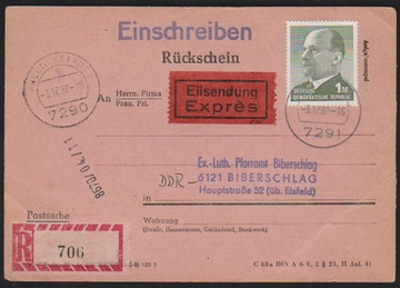 1 DM Ulbricht als ungewöhnliche Einzelfrankatur auf Eil-R-Rückschein aus der Bundesrepublik von Seewald bei Freudenstadt nach Biberschlag 1982