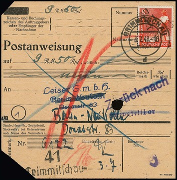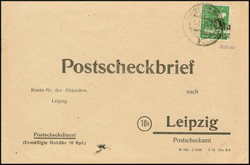 "16 Sonneberg", Brief mit MiF 2, 6, 10(2) u. 12 Pfg. Arbeiter, ferner Brief "16 Weimar" mit EF 84 Pfg. (Gebrauchsspuren), sowie "20 Naumburg" Postscheckbrief mit EF 10 Pfg., sign. Herbst