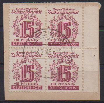 15 Pfg. Volkssolidarität in guter Farbe hellbraunkarmin im zentr. rundgest. Rand-Viererblock auf Briefstück, sign. Ströh. Mi. 152,- +