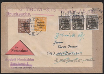 2 Pfg. Maschinenaufdruck im Dreierstreifen, nebst 15 u. 25 Pfg., auf NN-Retour-Drucksache aus Bautzen 1948