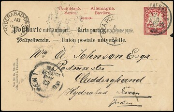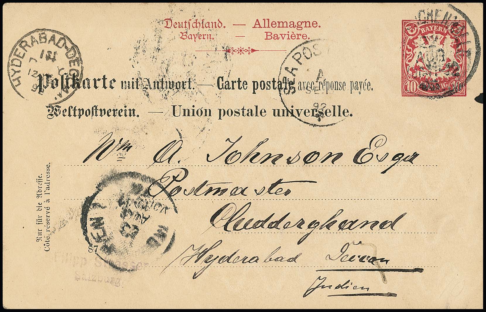 Doppelkarten-Ganzsache 10 Pfg., Frageteil 1892 von München nach Hyderabad in Indien, an den dortigen Postmeister (Nachfrage nach Briefmarken)