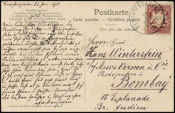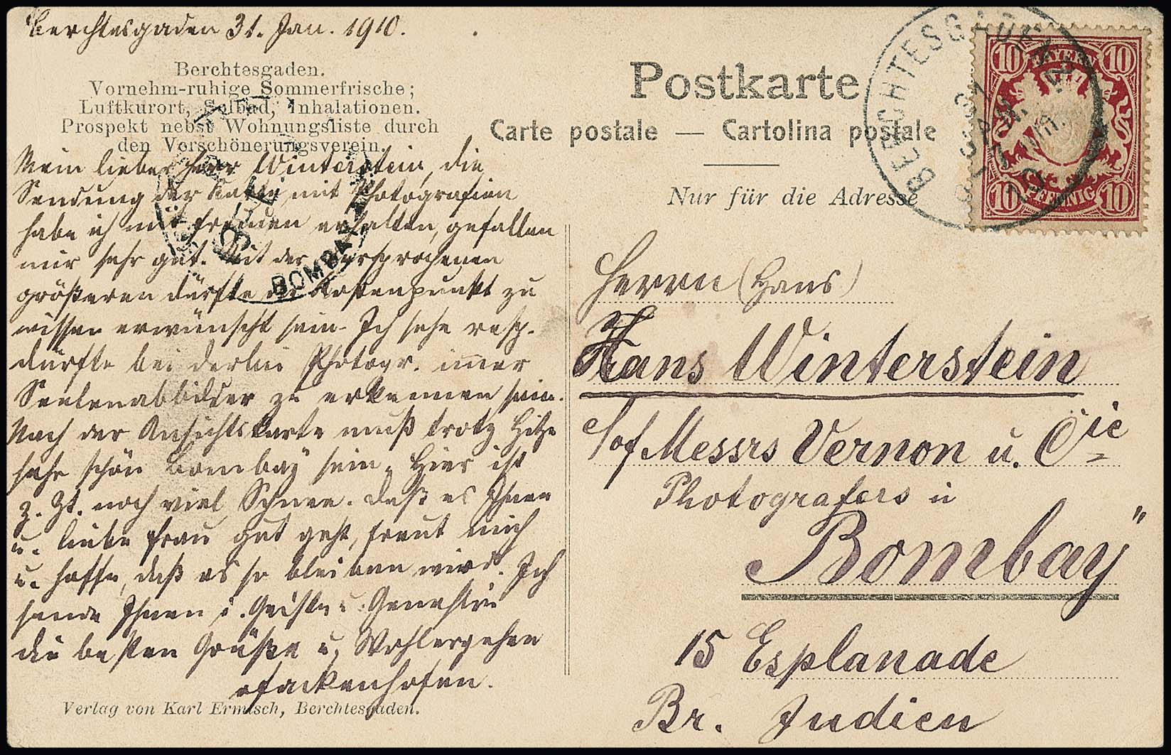 10 Pfg. auf Ansichtskarte von Berchtesgaden 1910 nach Bombay/Indien, typische leichte Gebrauchsspuren