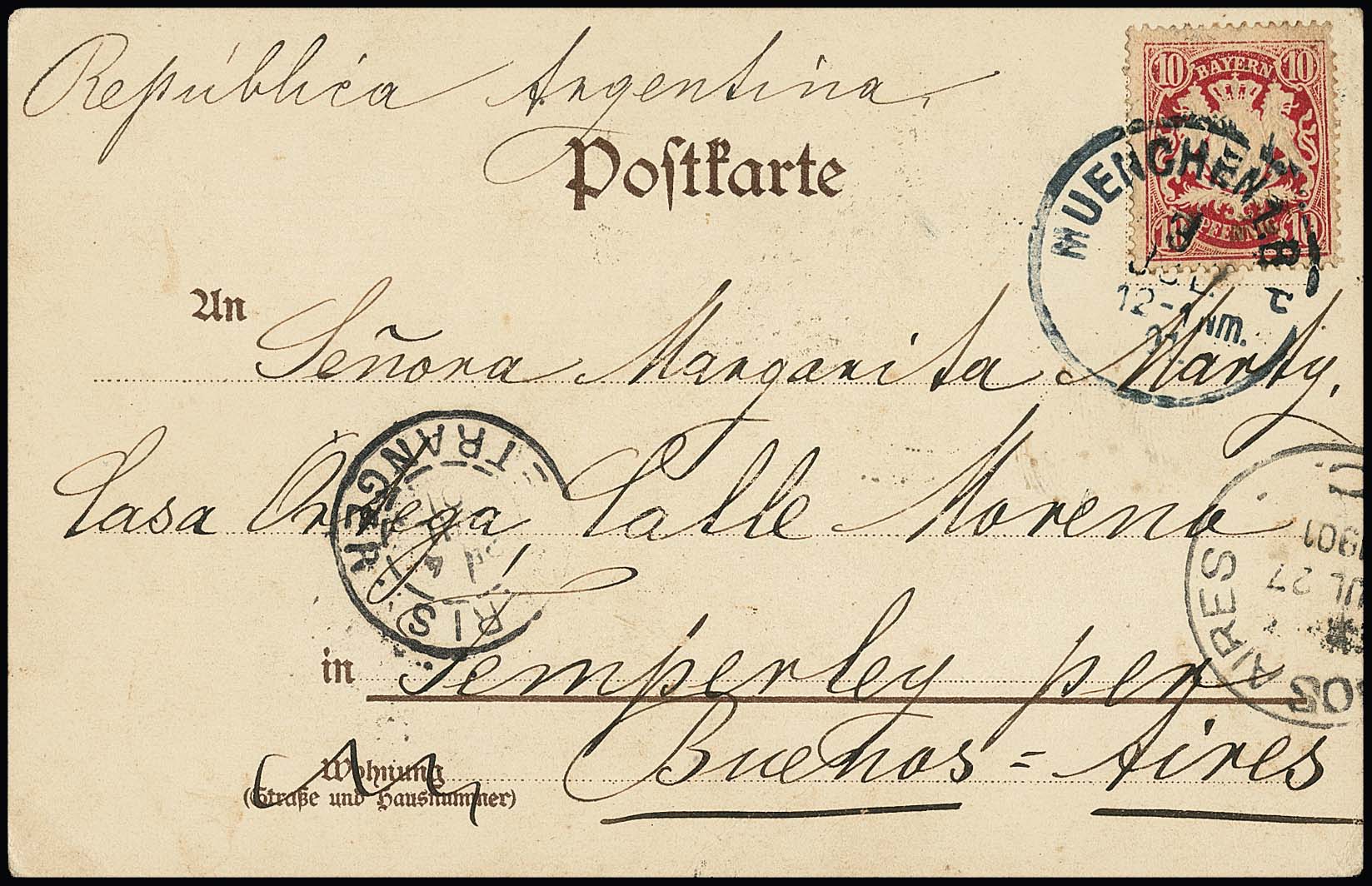 10 Pfg. einzeln auf Ansichtskarte 1901 von München nach Temperley, einem kleinen Ort in der Provinz Buenos Ayres/Argentinien, dazu 5 (Paar) und 10 Pfg. Luitpold in typischer Heftchenzhg. rs. auf Brief von Nürnberg 1912 an den französischen Vize-Konsul in Buenos Ayres