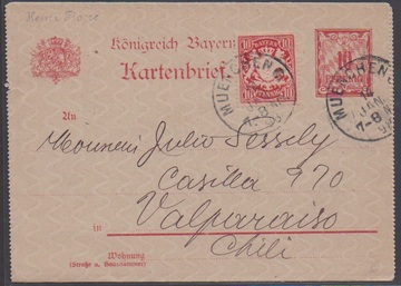 10 Pfg. auf Kartenbrief-Ganzsache 10 Pfg., von München 1898 nach Valparaiso/Chile