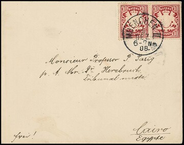 10 Pfg. im Paar auf Überseebrief von München 1888 nach Cairo/Ägypten, rs. unbed. Öffnungsmgl.