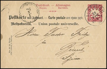 Ganzsachen-Doppelkarte 10 Pfg., Antwortteil noch ungebraucht anhängend (links kl. Randfleck), 1896 von Waldthurn nach Beirut (damals Syrien, heute Libanon)