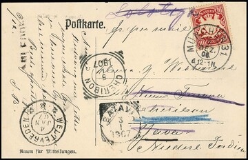 10 Pfg. (mit umgebogenen Zähnen aufgeklebt) auf Postkarte von München 1906 nach Cherikon, einer Hafenstadt an der Nordküste West-Javas (Indonesien), dort inländisch mehrfach nachgesandt