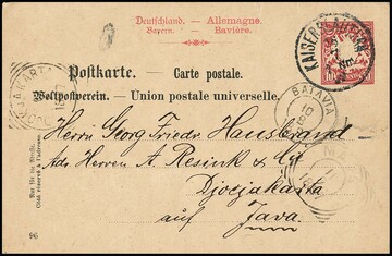 Ganzsachenkarte 10 Pfg. von Kaiserslautern 1897 nach Djokjakarta, eine Stadt in der Zentralregion der Insel Java (Indonesien), gelaufen. Seltene Destination!
