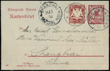 10 Pfg. auf Kartenbrief-Ganzsache 10 Pfg., 1903 von Schwandorf nach Shanghai/China, sowie 10 Pfg. einzeln auf Postkarte (bügig) von München 1906 nach Peking, beide mit Ankunftsstempel der Deutschen Post